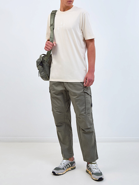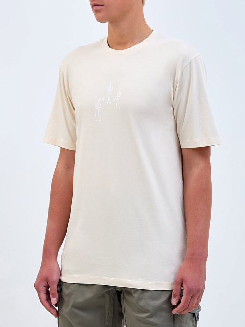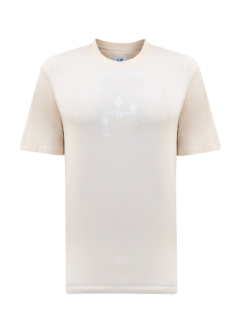 Мужская футболка в бежевом оттенке от C.P. Company. Минималистичная модель создана из мерсеризованного хлопкового джерси — дышащая и гигроскопичная ткань обеспечивает максимальный комфорт в движении. Графический принт на передней планке и спинке подчеркивает динамичный стиль изделия. Детали: круглый вырез горловины, короткие рукава.