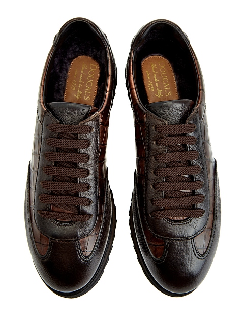 Стильные мужские кроссовки от Doucal’s выполнены в благородной коричневой гамме. Изделие из мягкой крупнозернистой кожи с тисненой текстурой дополнено густой овчиной, что делает модель особенно актуальной в холодное время года. Детали: трехслойная подошва, противоскользящий протектор. Сделано в Италии.