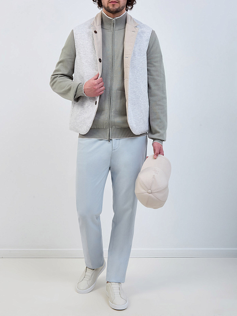 Двусторонний мужской жилет от Eleventy идеально подходит для создания многослойных образов. Модель создана из легкого льняного и хлопкового трикотажа с одной стороны, и из матового влагозащитного нейлона — с другой. Внутренняя стеганая отделка распределяет невесомый наполнитель, не допуская переохлаждения или перегрева. Воротник украшен деталями из мягкой замши. Детали: прорезные карманы, застежка на темные роговые пуговицы.