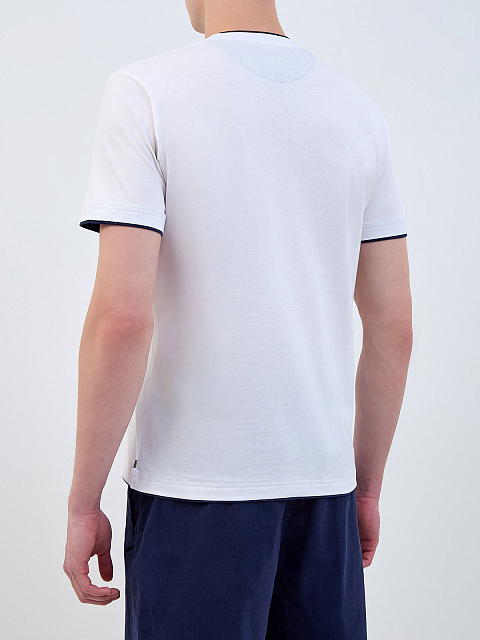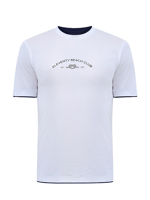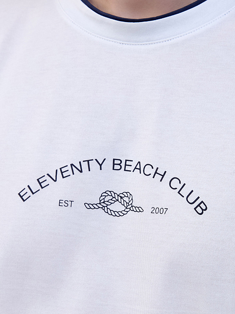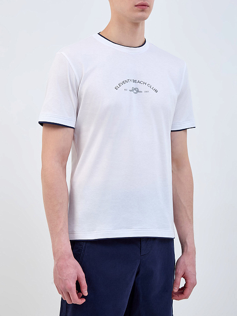 Футболка в базовом белом цвете от Eleventy выполнена из хлопкового джерси — легкой, гигроскопичной и эластичной ткани с полностью натуральным составом. Слегка приталенный крой остается комфортным в движении. Элементы расслабленного стиля — контрастная двухслойная отделка кромок и сезонный принт Beach Club. Детали: короткие рукава, круглый вырез. Сделано в Италии.