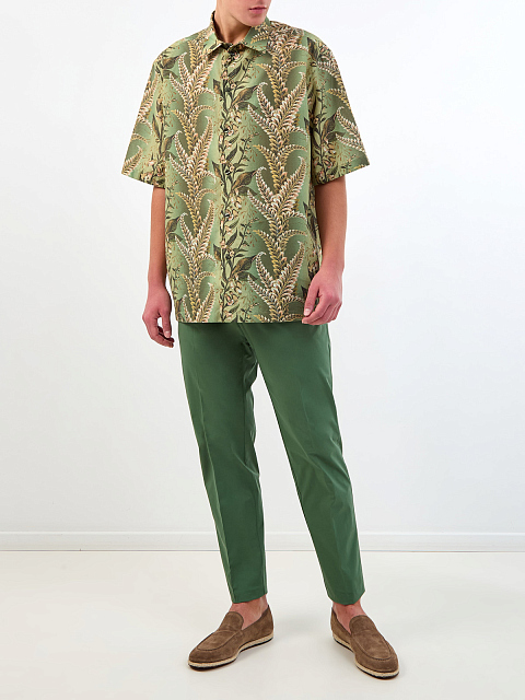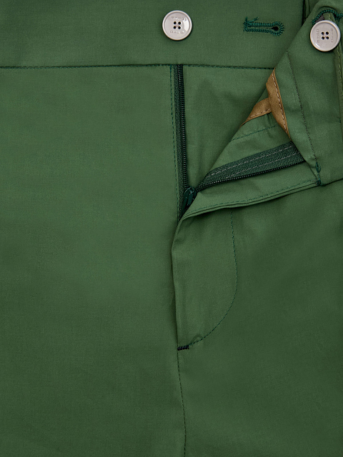 Легкие брюки-чиносы от Etro выполнены из гладкой хлопковой ткани в зеленом цвете. Невысокий процент эластичных волокон в составе предотвращает появление складок и облегчает уход за изделием. Диагональные французские карманы и эластичная вставка на поясе вносят в образ акцент в стиле sprezzatura. Детали: накладные карманы на спинке, регулируемая застежка на пуговицу и молнию. Сделано в Италии.