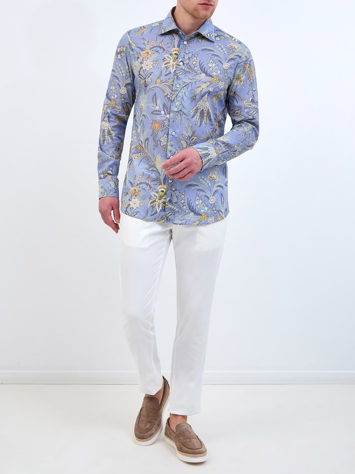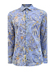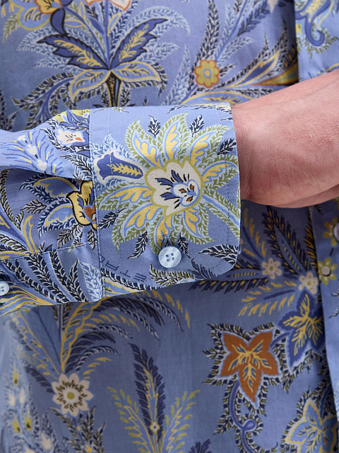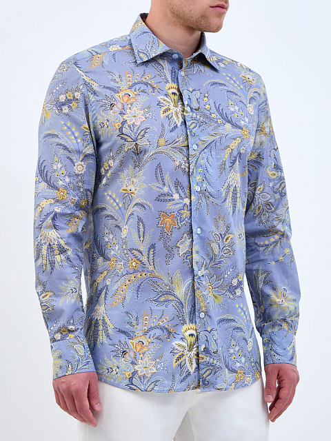 Мужская рубашка с длинным рукавом от Etro выполнена из гладкого хлопкового поплина. Поверхность модели декорирована набивным узором с флористическим мотивом — фирменным элементом Модного Дома. Изделие слегка приталенного кроя с классическим отложным воротником и застежкой на ряд пуговиц дополнено закругленными нижними кромками. Сделано в Италии.