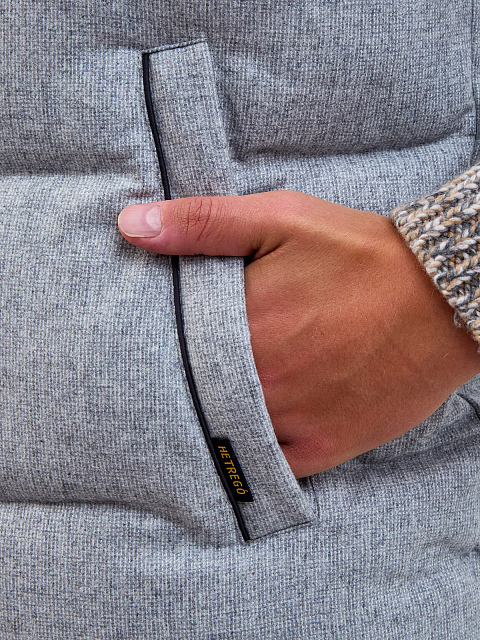 Стеганый мужской жилет от Hetrego выполнен из фактурной шерстяной фланели в меланжево-сером оттенке. Утепляющая прослойка из пуха и пера и глубокий капюшон надежно защищают от ветра, минималистичный дизайн идеально подходит для создания многослойных образов. Детали: застежка на молнию с двойным брендированным пуллером, прорезные карманы, внутренний карман на молнии.
