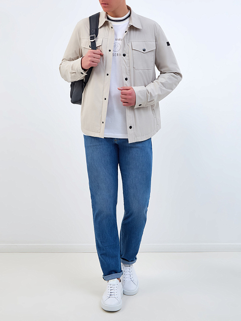 Легкая куртка-рубашка из влагозащитного нейлона от Hetrego сочетает универсальный крой и внимание к деталям. Модель в нейтральном бежевом оттенке отличается практичным дизайном с центральной планкой на контрастных кнопках, накладными и прорезными карманами, а также лаконичными элементами — фирменным патчем на рукаве и отложным воротом.