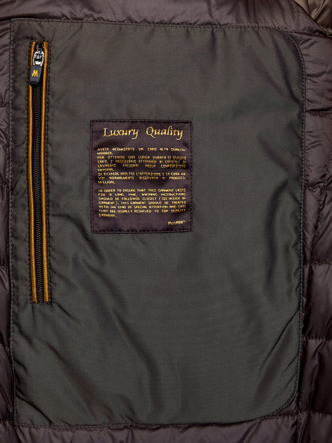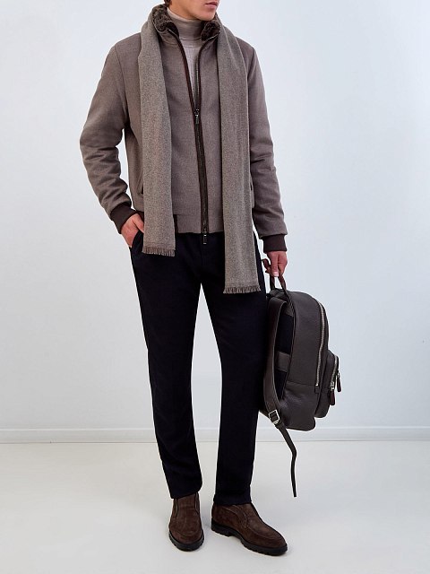 Бомбер Bellati в коричневой гамме от Moorer создан из плотной шерстяной фланели и кашемира, утепляющая прослойка из гусиного пуха и пера обеспечивает максимальный комфорт в непогоду. Съемный вставка на вороте из мягкой овчины и отделка из эко-замши создают образ в расслабленном стиле casual. Детали: прорезные карманы, застежка на молнию с двойным пуллером, эластичные кромки. Сделано в Италии.