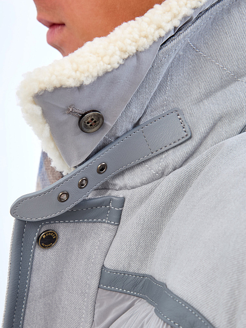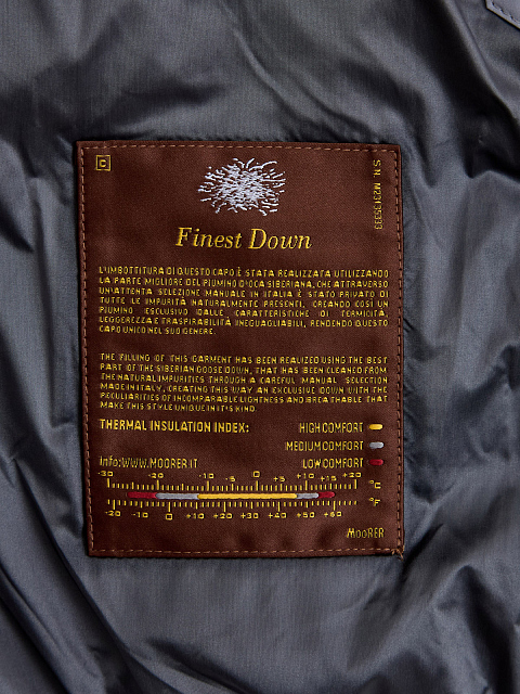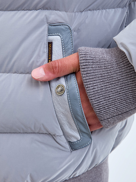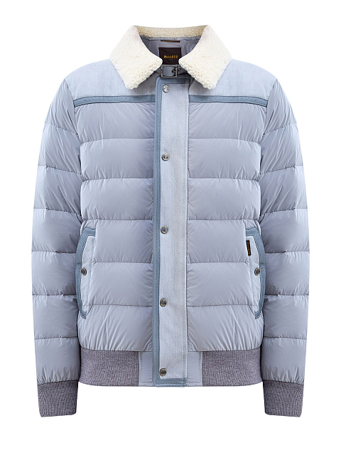 Стеганая куртка-бомбер от Moorer сочетает влагозащитный матовый нейлон, вставки из плотного габардина и кожаные детали. Подкладка из мягкого гусиного пуха обеспечивает максимальный комфорт в осенне-зимний сезон, съемный воротник из овчины защищает от холодного воздуха. Детали: ворот с кожаным ремешком и пряжкой, двойная линия застежки, прорезные внешние карманы, трикотажный низ и манжеты, внутренние карманы для документов. Сделано в Италии.