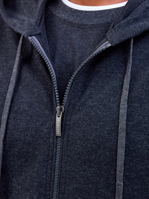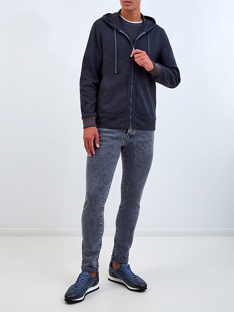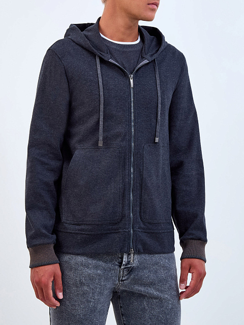 Толстовка в спортивном стиле от Peserico выполнена в меланжево-сером оттенке из хлопка. Выверенный состав с эластичными волокнами делает модель идеальной для поездок и активного отдыха. Контрастная отделка манжет в английскую резинку вносит в образ динамичный акцент. Детали: капюшон на кулиске, застежка-молния, два кармана. Сделано в Италии.