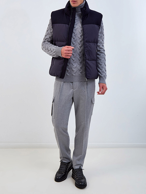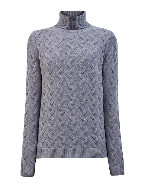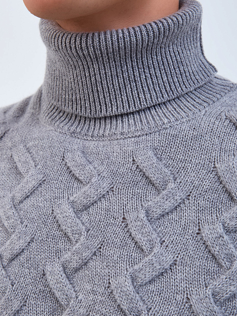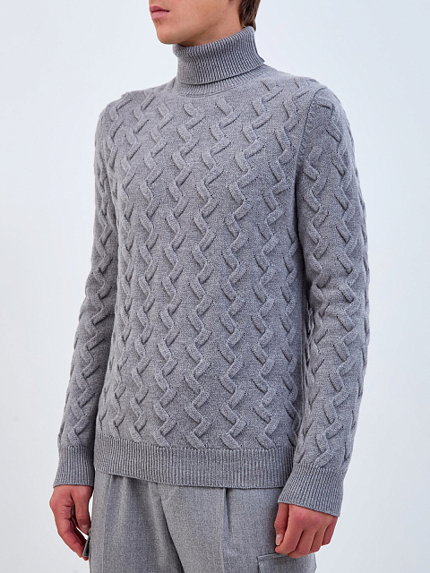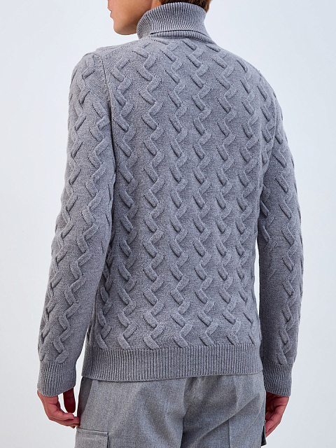 Мужской свитер в меланжево-серой гамме от Peserico. Модель из фактурной пряжи на основе ценных волокон шерсти и кашемира идеально подходит для создания повседневных аутфитов, объемный вязаный узор в тон придает образу расслабленное настроение. Высокий ворот в технике английской вязки дополнительно защищает от ветра. Сделано в Италии.