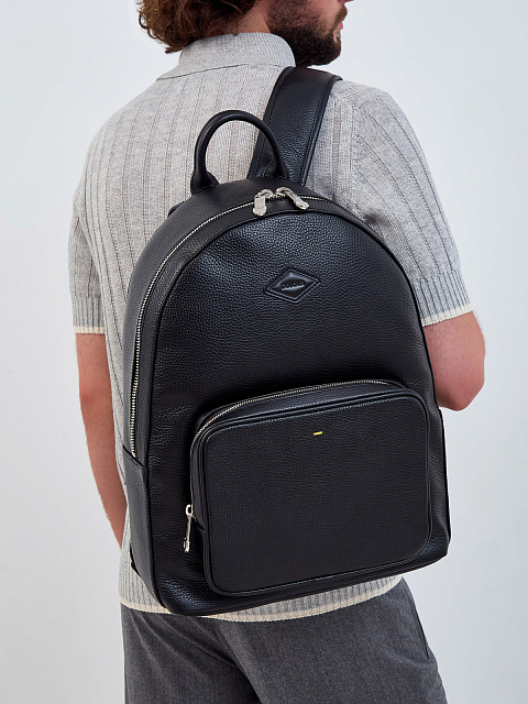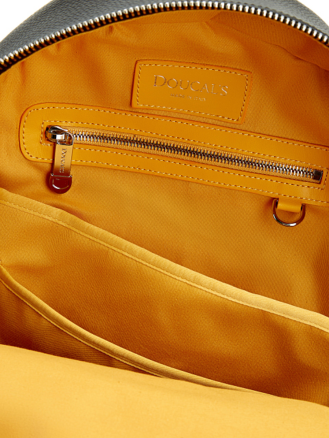 Черный мужской рюкзак от Doucal’s выполнен вручную из плотной крупнозернистой кожи. Аксессуар в городском стиле с вместительным отделением на знаковой желтой подкладке оснащен внешним карманом, мембранной спинкой, широкими регулируемыми бретелями и ручкой для дополнительного комфорта. Фирменный стиль подчеркивает патч из гладкой кожи с тисненым логотипом бренда и портновский стежок. Сделано в Италии.