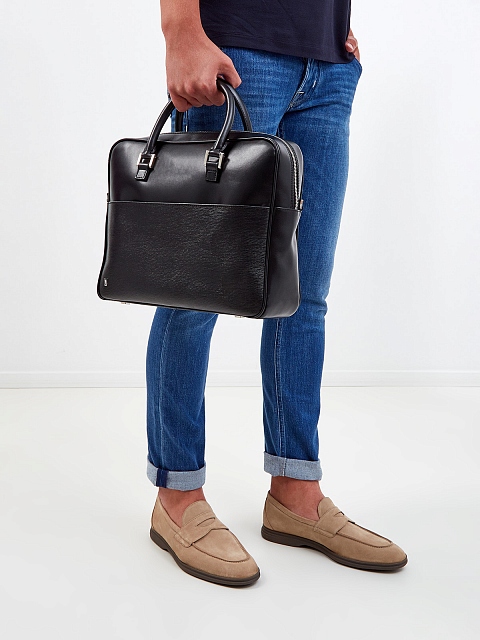 Мужская сумка в лаконичной черной гамме от Moreschi создана из окрашенной вручную кожи, отделка saffiano защищает аксессуар от повреждений. Изделие хорошо держит форму и идеально подходит для ноутбука и документов. Функциональный дизайн предусматривает съемный плечевой ремень и эргономичные ручки, а также дополнительный внешний карман. Детали: застежка на молнию с двойным пуллером, одно отделение, литой логотип бренда. Сделано в Италии.