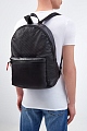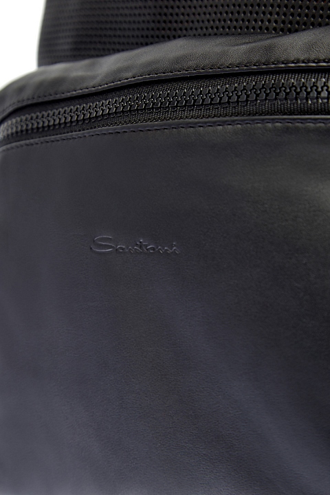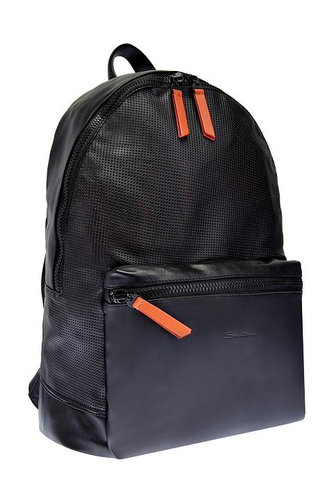 Минималистичный мужской рюкзак от Santoni выполнен из мягкой перфорированной кожи с натуральным рисунком. Аксессуар в черном цвете с объемным накладным карманом на молнии, в который по желанию можно свернуть изделие. Вместительное внутреннее отделение полностью на подкладке фирменного оранжевого цвета. Детали: застежка с двумя контрастными пуллерами, регулируемые бретели. Сделано в Италии.