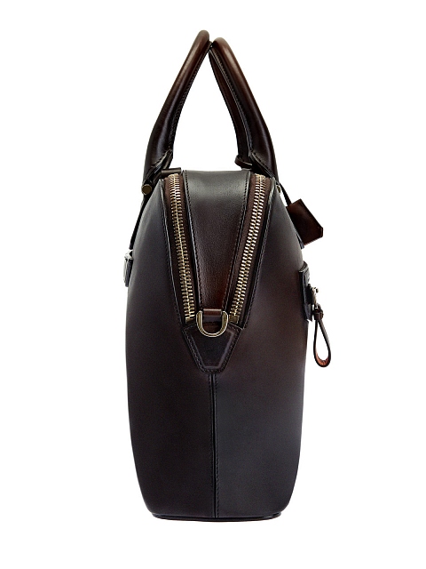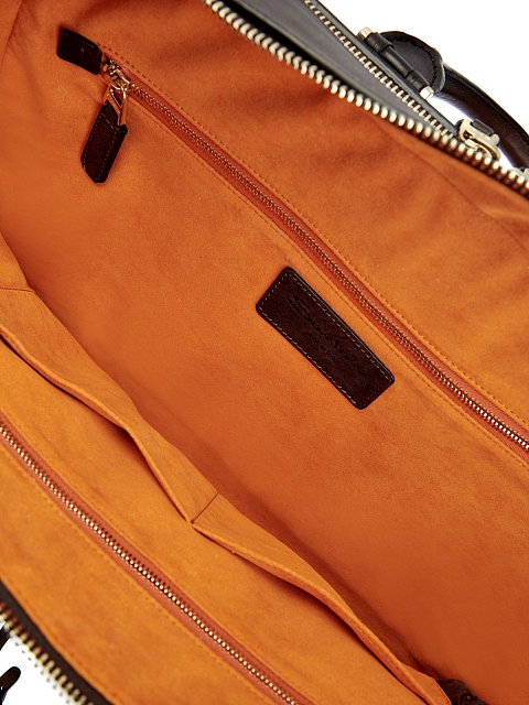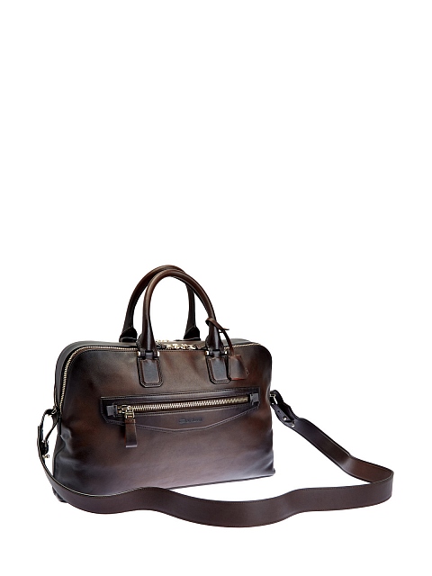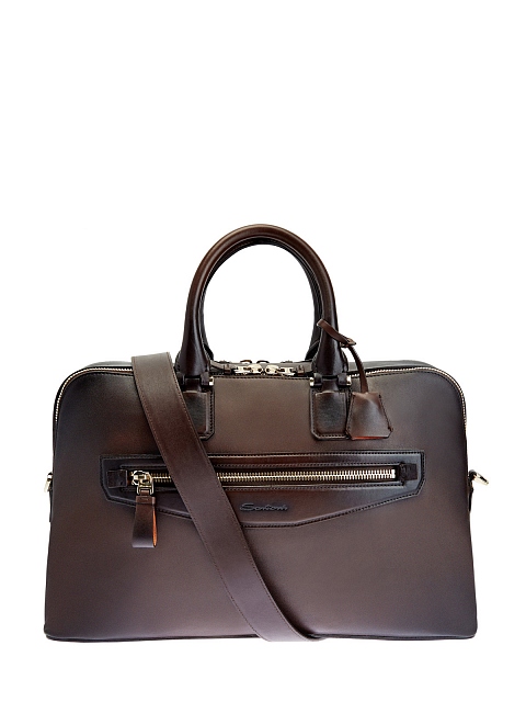 Лаконичная мужская сумка в кофейных тонах от Santoni создана из окрашенной вручную кожи. Изделие хорошо держит свою форму и идеально подходит для ноутбука и документов. Функциональный дизайн предусматривает съемный плечевой ремень и эргономичные ручки, а также дополнительный внешний карман на молнии. Детали: подкладка в фирменном оранжевом цвете, два отделения, тисненый логотип бренда. Сделано в Италии.
