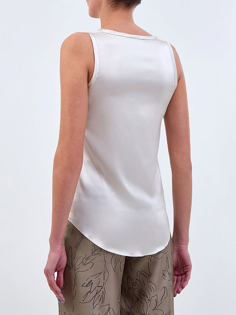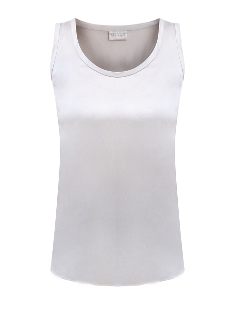 Элегантный топ от Brunello Cucinelli выполнен из гладкого шелкового сатина в жемчужно-белом оттенке. Слегка облегающий фигуру крой и однотонное исполнение делают модель незаменимым элементом женского гардероба. Детали: круглый вырез горловины, вытачки для посадки по фигуре, закругленные нижние кромки. Сделано в Италии.
