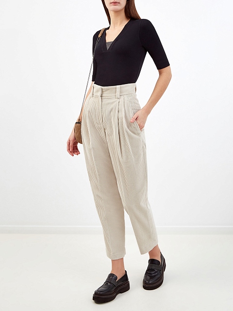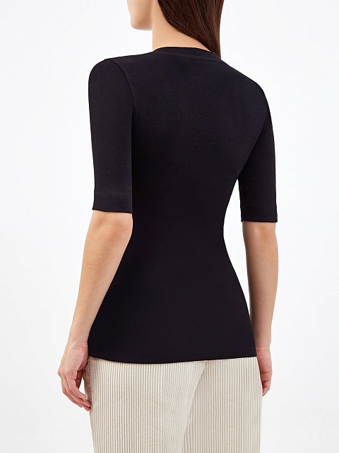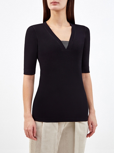 Элегантная женская футболка в черном цвете от Brunello Cucinelli выполнена из мягкого хлопка в рубчик. Дышащая ткань идеально подходит для создания повседневных образов, эластичные волокна в составе облегчают уход за изделием. Фирменный штрих — цепочка мерцающих бусин Мониль ручной огранки на V-образном вырезе. Детали: короткие рукава, удлиненный облегающий силуэт. Сделано в Италии.