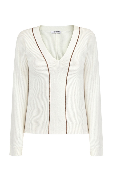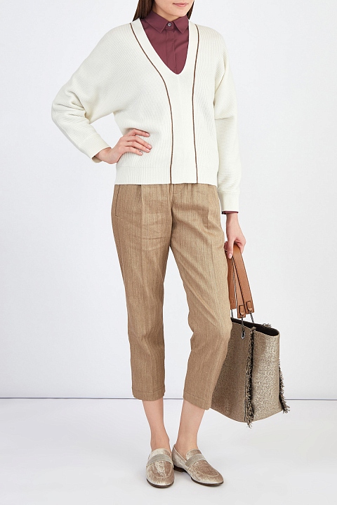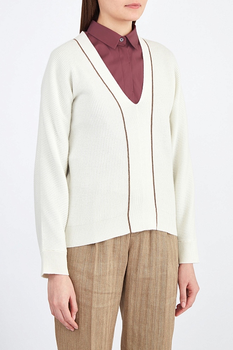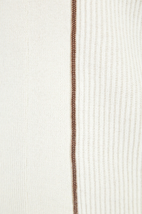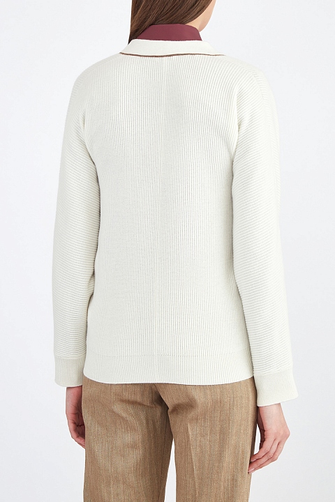 Лаконичный джемпер сливочного оттенка от Brunello Cucinelli полностью выполнен из кашемировой пряжи двухниточного плетения. Модель выполнена в технике эластичной английской резинки в крупный рубчик. Контраст фактур формирует обрамляющая горловину вставка по передней планке, созданная в технике чулочной вязки. Фирменный стиль подчеркнут вышивкой мерцающей цепочкой мониль. Сделано в Италии.