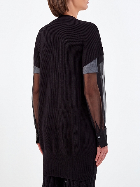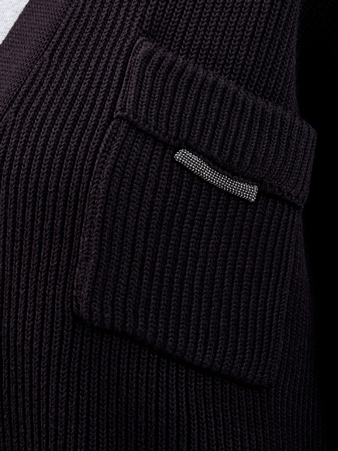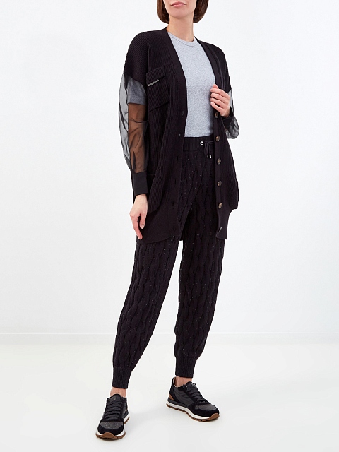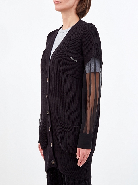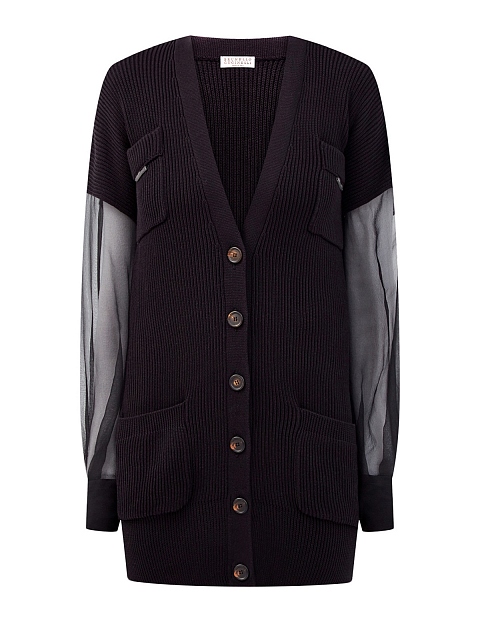 Удлиненный женский кардиган от Brunello Cucinelli создан из мягкой хлопковой пряжи в черном цвете. Техника эластичной вязки в английскую резинку подчеркивает расслабленный стиль изделия, полупрозрачные рукава из шелка Crispy вносят в образ изящный акцент. Детали: застежка на пуговицы, накладные карманы, вышивка Мониль. Сделано в Италии.