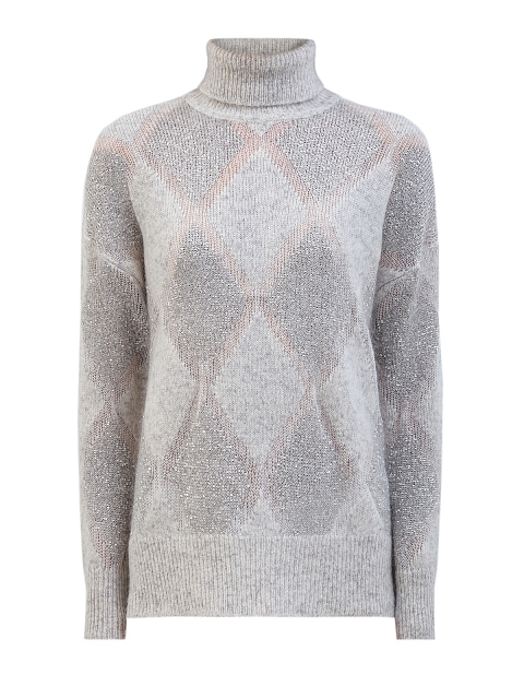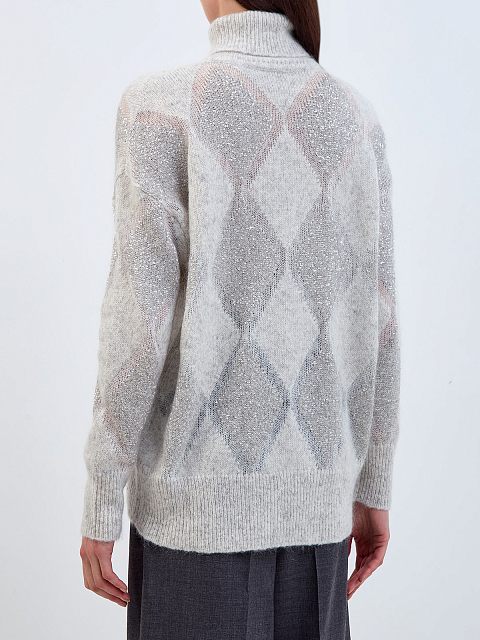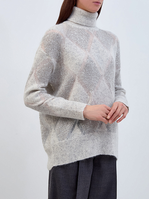 В женском свитере Dazzling Argyle от Brunello Cucinelli элегантная эстетика сочетается с комфортным кроем. Деликатный блеск пайеток образует изящный мотив в виде ромбов, который подчеркивается сезонными оттенками. Детали: спущенный плечевой шов, высокий ворот, окантовка кромок английской вязки.
