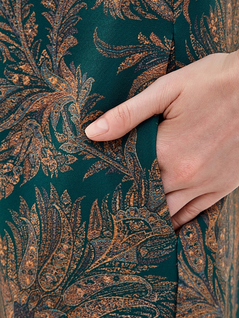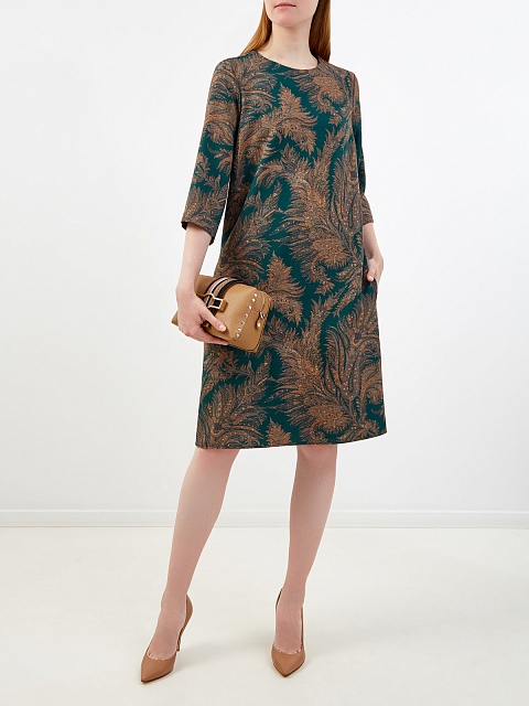 Женственное платье А-силуэта от Etro выполнено из тонкой струящейся ткани с добавлением древесных волокон вискозы. Узнаваемый почерк бренда прослеживается в набивном паттерне с мотивом пейсли. Модель с рукавами ¾, круглой проймой горловины и прорезными карманами дополнена застежкой на потайную молнию на спинке. Сделано в Италии.