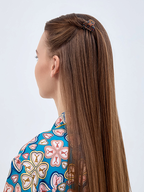 Заколка с пружинным механизмом от Etro выполнена из прочного ацетата с полупрозрачной текстурой. Внутренний слой создан из воздушного шелка с фирменным набивным принтом. Аксессуар дополнен мерцающим кристаллом в розовом оттенке. Сделано в Италии.
