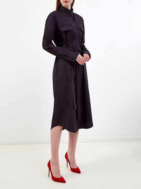Стиль: Платье-рубашка, Миди, Однотонный, Длинный, С поясом