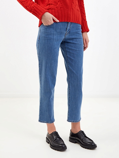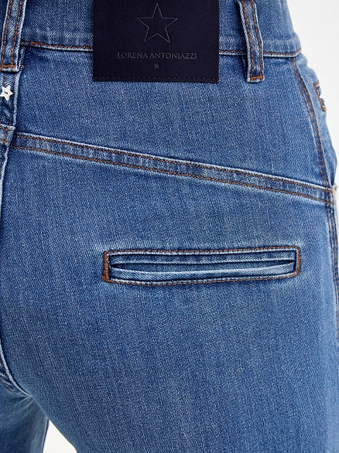 Базовые джинсы укороченного кроя от Lorena Antoniazzi выполнены в классическом синем оттенке. Плотный хлопковый деним с добавлением эластана не стесняет движений, контрастная прострочка швов подчеркивает настроение в стиле ретро. Детали: прорезные карманы, литая символика бренда, застежка на молнию и пуговицу, высокая посадка. Сделано в Италии.