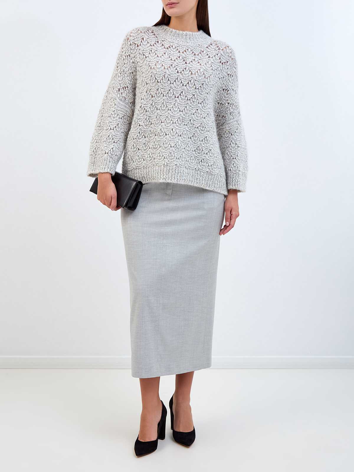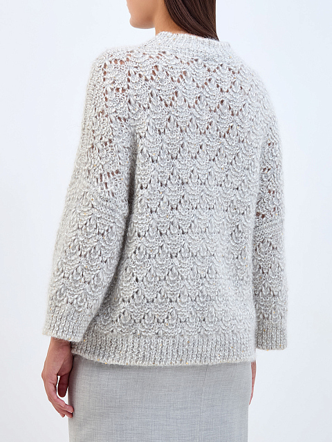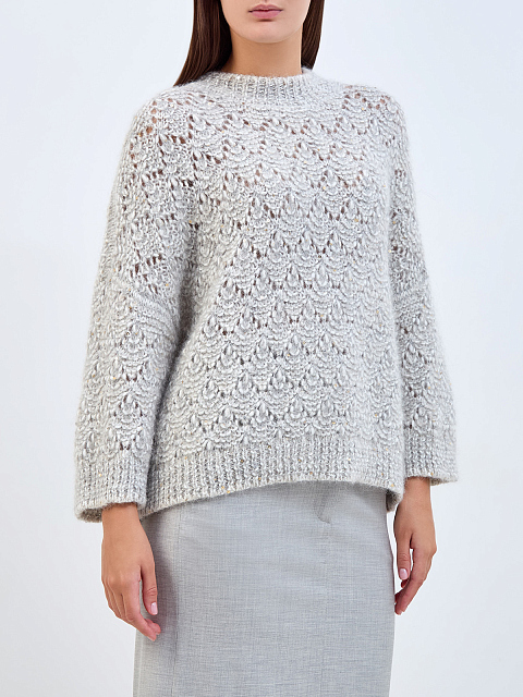 Женский джемпер в пепельно-серой гамме от Peserico выполнен из мягкой пряжи на основе шерсти альпака. Эластичные волокна в составе предотвращают потерю формы и образование складок, а ценные свойства натурального материала обеспечивают тепло и комфорт. Техника узорной вязки и золотистые вплетенные пайетки делают модель универсальным элементом расслабленных повседневных образов. Сделано в Италии.