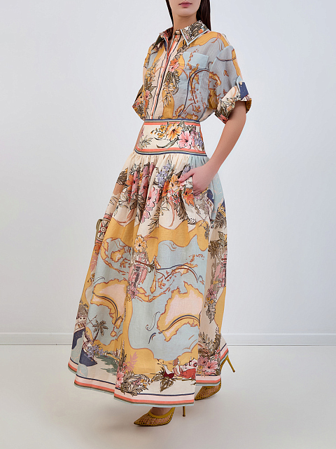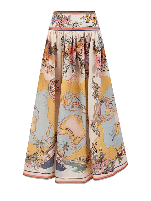 Женственная юбка объемного кроя Tallow от Zimmermann станет идеальным выбором для расслабленных аутфитов в летний сезон. Модель создана из тонкого дышащего льна и дополнена принтом Nautical Map из капсульной коллекции Resort Swim 2025. Детали: потайная молния на спинке, два прорезных кармана.