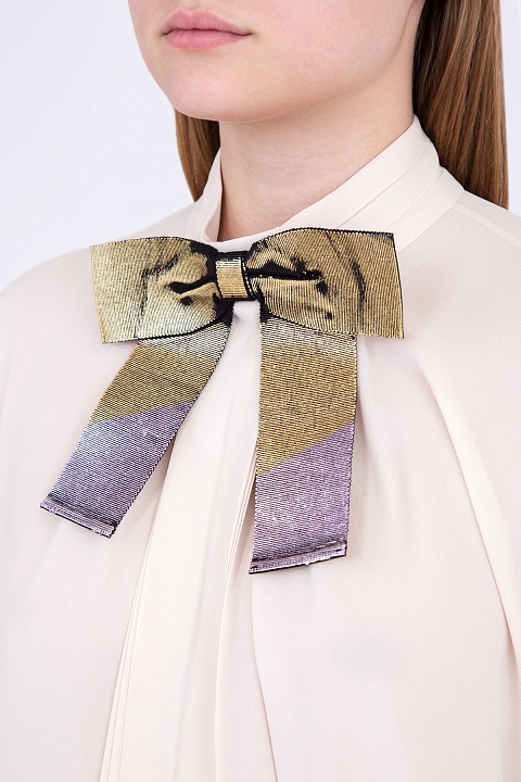 Винтажная брошь в виде банта из весенне-летней коллекции Gucci выполнена из фактурного текстиля золотистого и нежно-фиолетового цветов с плавным градиентным переходом. Декоративные складки с эффектом состаренной ткани дополняют образ. Изделие оснащено фиксатором-булавкой.