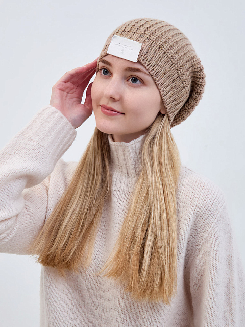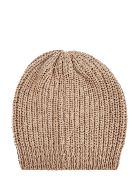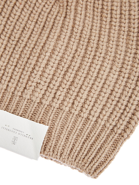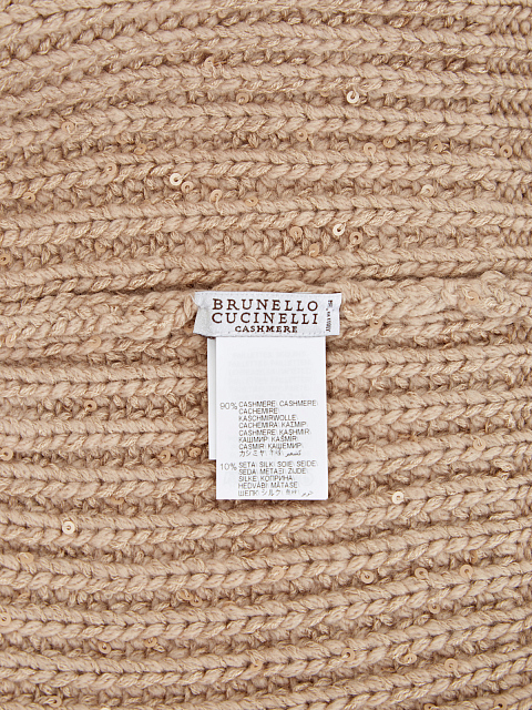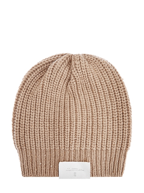 Элегантная шапка от Brunello Cucinelli выполнена в бежевом оттенке. Для создания модели была выбрана мягкая пряжа на основе благородного кашемира Piuma и шелка Diamante. За счет особого строения волокон аксессуар надежно сохраняет тепло и обеспечивает идеальную посадку. Миниатюрные пайетки, вшитые в нить вручную, придают головному убору мерцающий блеск. Сделано в Италии.