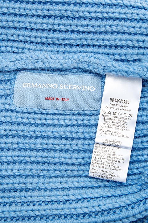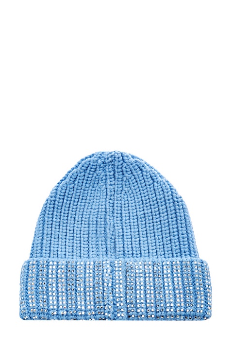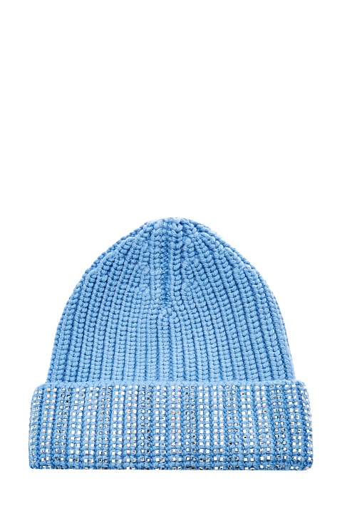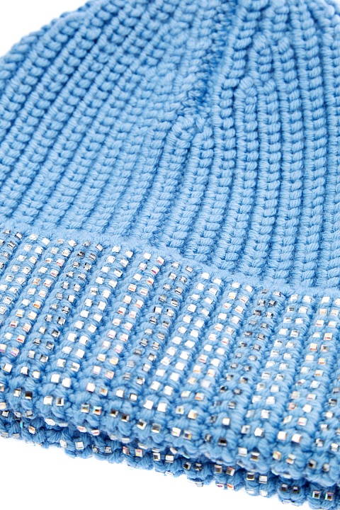Стильная шапка от Ermanno Scervino полностью выполнена из теплой шерстяной пряжи в технике гладкой вязки. Холодный голубой оттенок дополнен мерцающими кристаллами. Благодаря плотному расположению петель аксессуар надежно защищает от низких температур, а широкий отворот обеспечивает комфортную посадку. Сделано в Италии.