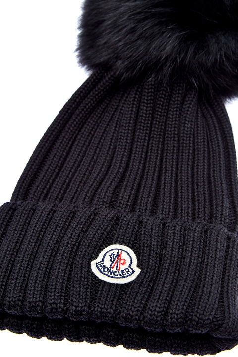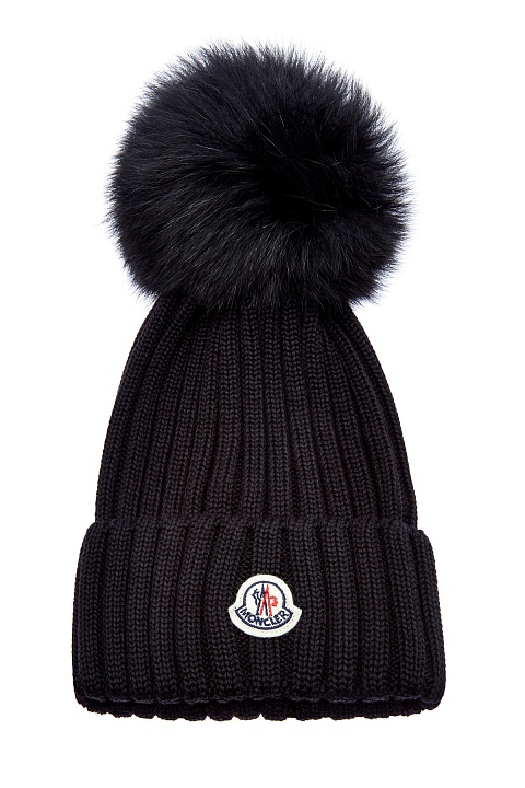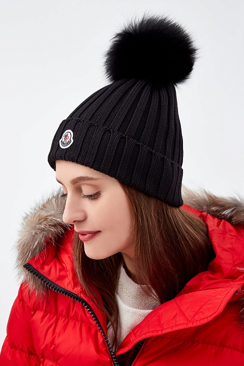 Базовая женская шапка от Moncler полностью выполнена из теплой шерстяной пряжи Virgin в черном цвете. Техника вязки в фактурный широкий рубчик придает аксессуару эластичность, а широкий отворот дополнительно защищает от ветра. Тулья декорирована объемным помпоном из меха финской лисы в тон изделию, фирменный стиль подчеркивает нашивка из фетра с монограммой бренда.