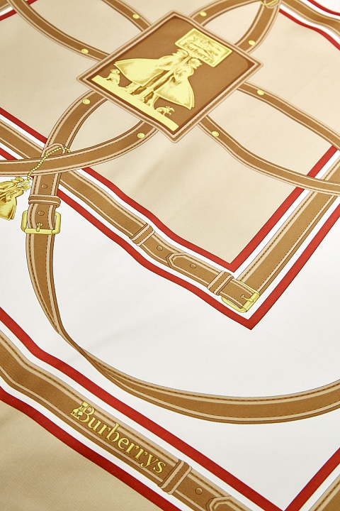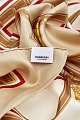 Элегантный платок от Burberry выполнен из итальянского шелкового твила. Атласная поверхность изделия украшена принтом с изображением ремешка, который был позаимствован из архива бренда. Аксессуар в теплом медовом оттенке дополнен объемным швом по краям. Параметры 90×90 см.