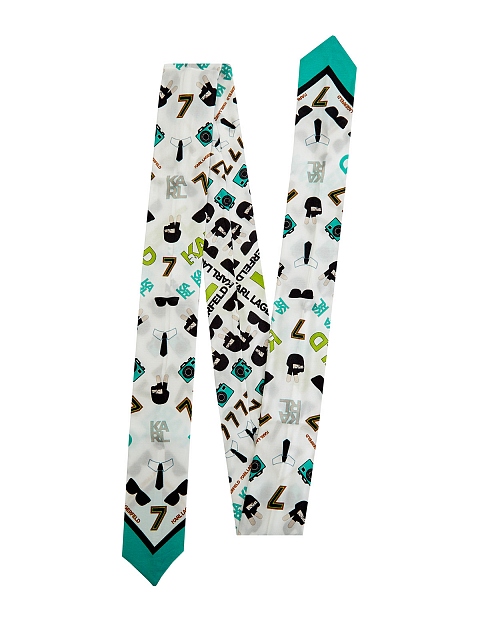Узкий шарф-галстук от Karl Lagerfeld украшен культовыми логотипами и принтом K/Favorite в виде солнцезащитных очков и митенок. Модель из гладкого шелка станет эффектным дополнением повседневных образов.
