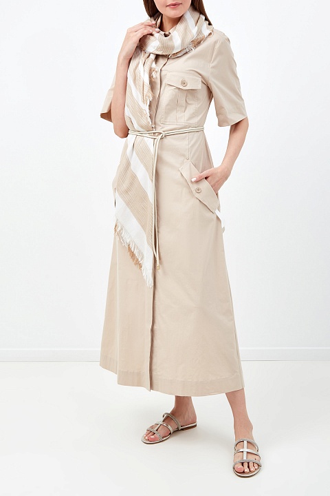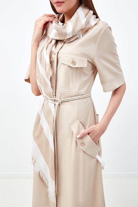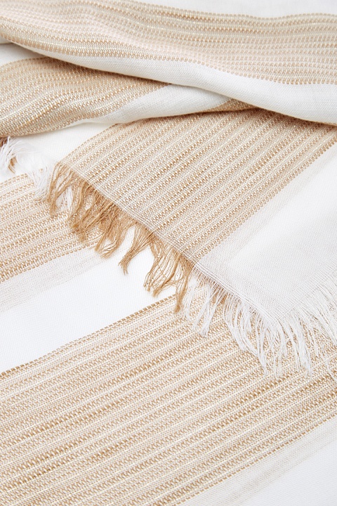Воздушный платок от Lorena Antoniazzi создан из фактурного тканого хлопка и мягкого модала. Цветовая гамма в карамельных и молочно-белых тонах — универсальное решение для легких образов сезона весна-лето. Бахрома на кромках придает дизайну нотку расслабленного стиля sprezzatura. Сделано в Италии.