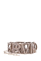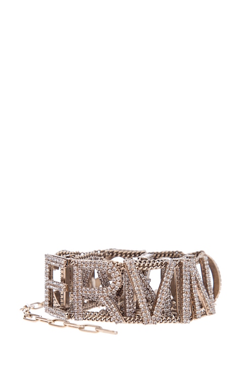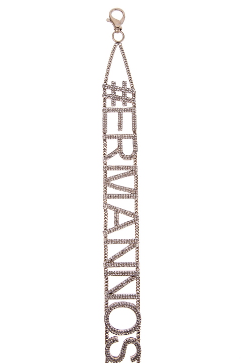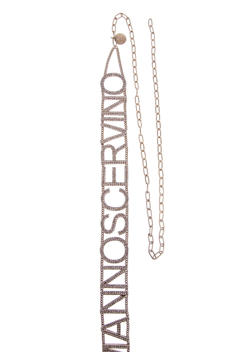 Эффектный ремень от Ermanno Scervino выполнен в виде хэштега с монограммой Модного дома из латунного сплава оттенка античного золота. Буквы инкрустированы сверкающими стразами из стекла. Нотки стиля грандж в образ вносит массивный карабин застежки и регулирующая цепь с крупными звеньями. Ширина 3 см. Сделано в Италии.