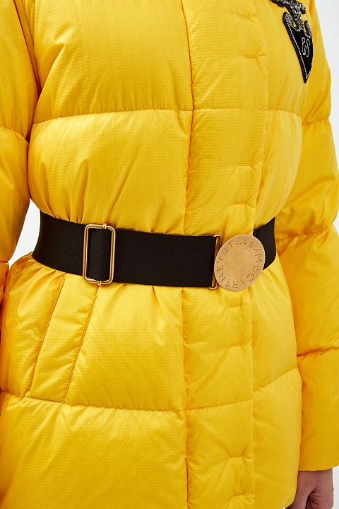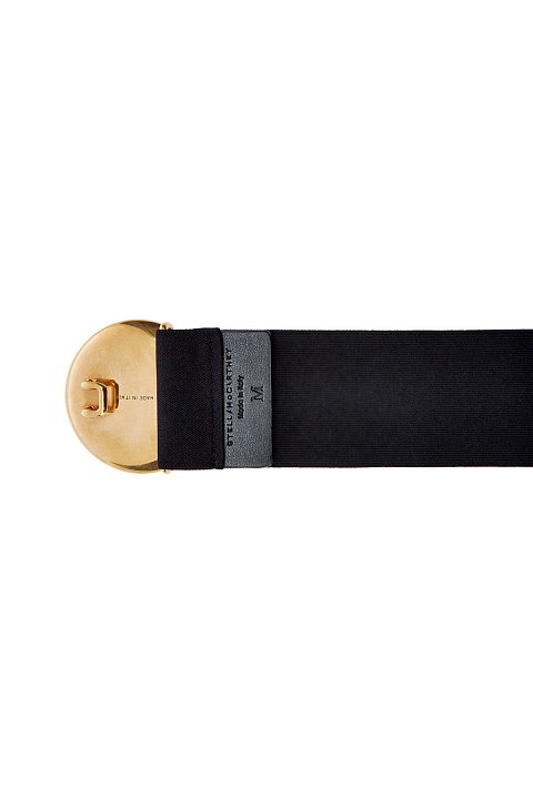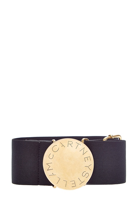 Широкий ремень от Stella McCartney выполнен из эластичной ленты. Литая пряжка с напылением золотистого цвета украшена перфорированным логотипом. Аксессуар регулируется по обхвату талии. Детали: застежка на крючок, отделка из эко-кожи, ширина 4 см.