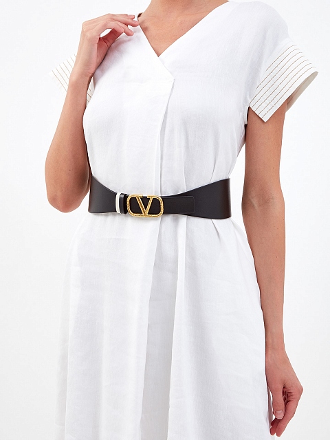 Широкий ремень от Valentino Garavani создан из матовой телячьей кожи — фигурные срезы и пряжка VLOGO с напылением оттенка античной латуни придают образу изысканный штрих. Классический черный цвет позволяет интегрировать аксессуар практически в любой образ, двойные шлевки и внутренняя белая поверхность делают дизайн еще более универсальным. Сделано в Италии.
