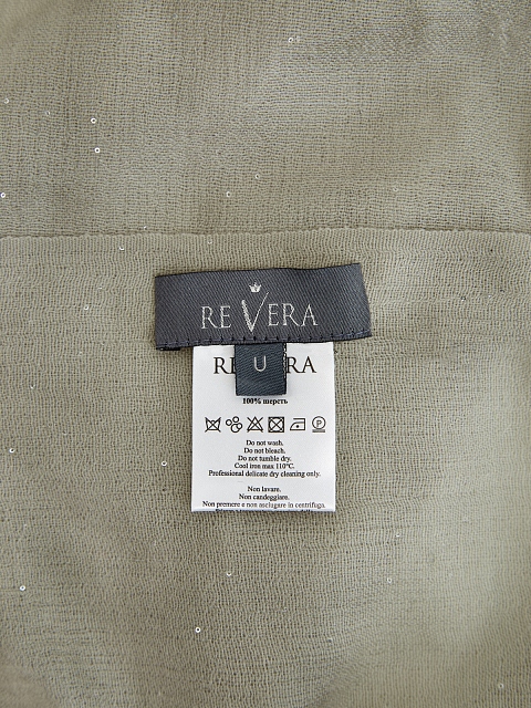 Элегантный палантин от Re Vera создан в приглушенном оливковом оттенке из тонкой шерстяной пряжи. Оптимальная толщина волокон образует легкую и мягкую фактуру, вплетенные миниатюрные пайетки придают аксессуару мерцающий штрих. Короткая бахрома по краю изделия завершает дизайн.