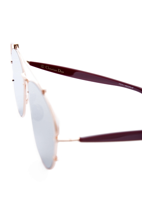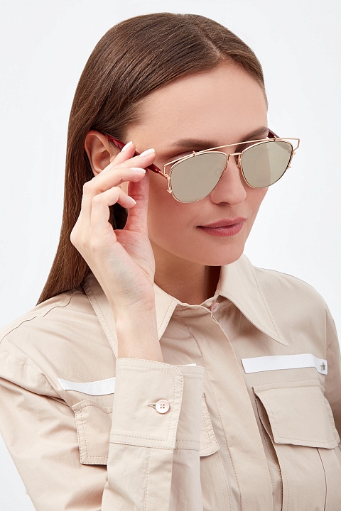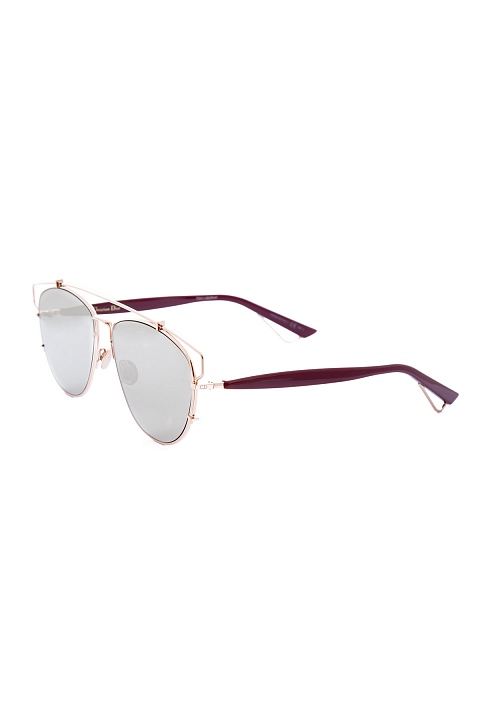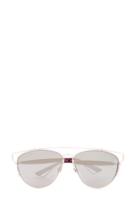 Женские солнцезащитные очки «Technologic» Dior формы «pantos» с ажурной оправой и дужками-дугами из металла золотистого оттенка, которые гармонируют с ультратонкими затемненными стеклами. Модель без диоптрий с поляризационным зеркальным покрытием, которое защищает сетчатку глаз от ультрафиолетовых лучей. Очки предоставляются в фирменном чехле.