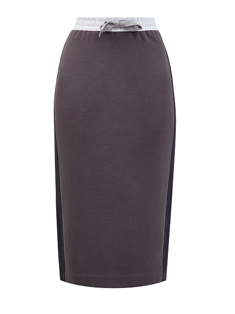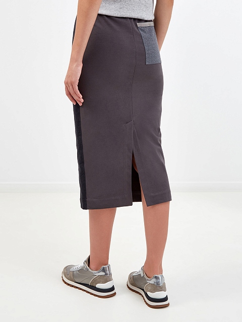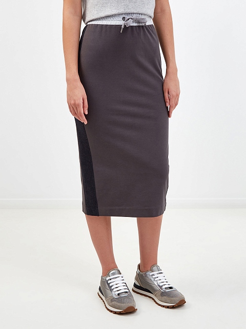 Облегающая юбка-миди Paneled из коллекции Travelwear от Brunello Cucinelli выполнена из эластичного хлопкового футера. Боковые лампасы в динамичном стиле Active визуально вытягивают силуэт, а контрастный карман на спинке с мерцающей отделкой придает изделию изысканный штрих. Эластичный пояс на кулиске обеспечивает максимальный комфорт в движении. Сделано в Италии.