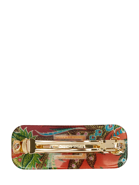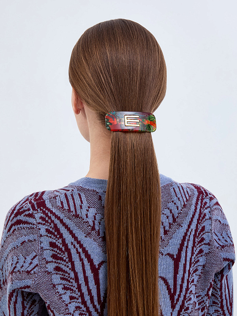 Изящный женский аксессуар для волос — механическая заколка из коллекции бренда Etro. Модель выполнена из прочного ацетатного пластика с флористическим узором пейсли и эмблемой бренда в виде буквы «E» с напылением оттенка «античная латунь». Сделано в Италии.