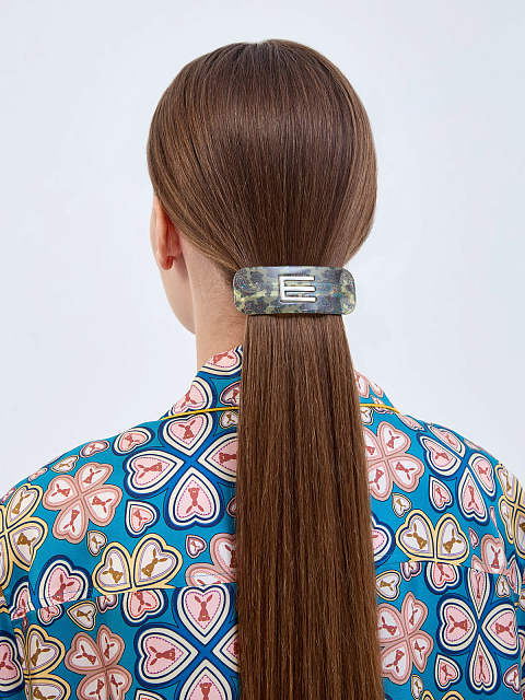 Изящный женский аксессуар для волос — механическая заколка из коллекции бренда Etro. Модель выполнена из прочного ацетатного пластика с шелковой вставкой с узором пейсли внутри. Эмблема бренда в виде буквы «E» с напылением оттенка «античная латунь» завершает дизайн. Сделано в Италии.