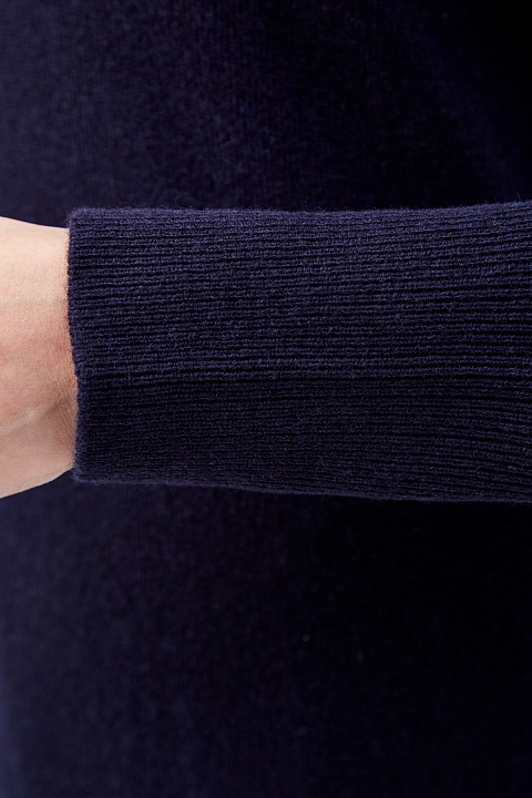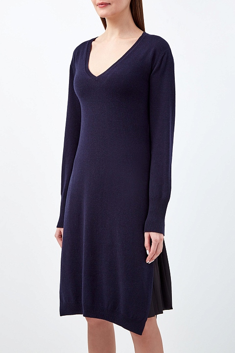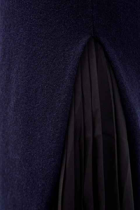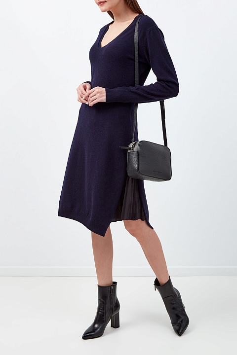 Платье в стиле спортшик от Fabiana Filippi выполнено в сапфирово-синем цвете из фирменной пряжи Platinum на основе шерсти мериноса, кашемира и шелка. Полностью натуральный состав делает модель особенно актуальной в холодный сезон. Свободный силуэт со спущенной линией плеч и боковыми разрезами не стесняет движений. Многослойный образ создает внутренняя съемная комбинация из плиссированного шифона. Длина по спинке 98 см. Сделано в Италии.