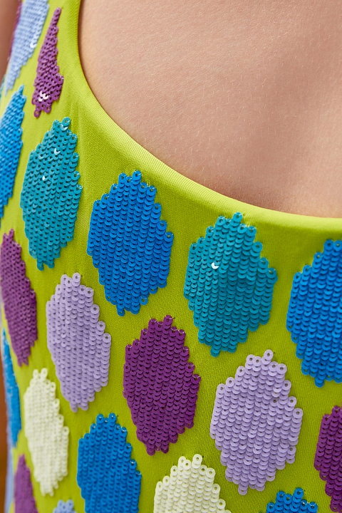 Яркий слитный купальник в оттенке лайма от Fisico создан из эластичного быстросохнущего материала на основе микрофибры. Гладкая ткань подчеркивает плавные линии кроя и обеспечивает максимальный комфорт. Динамичный акцент образу придает контрастная вышивка в геометрическом стиле, выполненная из пайеток с легким глянцевым блеском. Модель с глубоким вырезом на спинке дополнена фирменным логотипом с монограммой бренда.