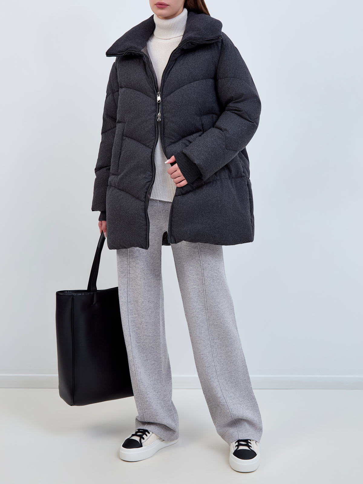 Кашемировый пуховик с вязаной отделкой и воротом-стойкой