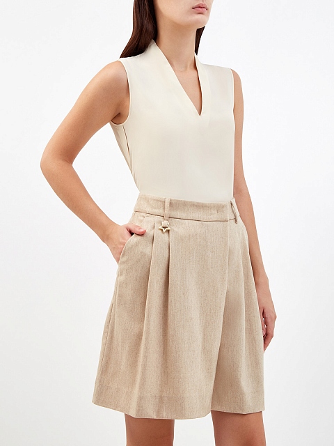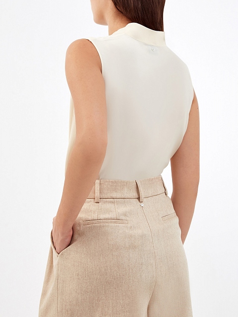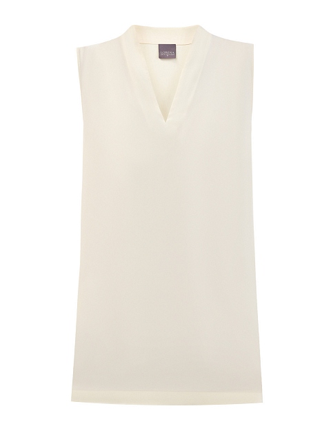 Базовый топ в элегантном кремовом оттенке от Lorena Antoniazzi создан из гладкого атласа с благородным жемчужным переливом по поверхности. Фирменный стиль подчеркивает миниатюрная деталь в виде звезды из перламутра на спинке. Детали: V-образный вырез горловины, без рукавов. Сделано в Италии.