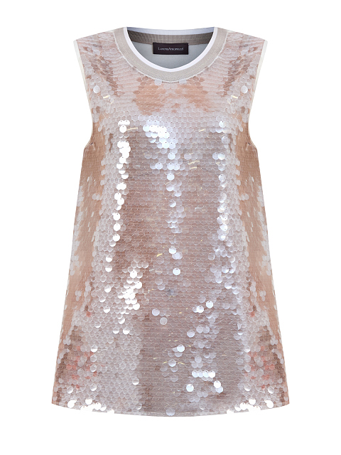 Элегантный топ от Lorena Antoniazzi станет идеальным завершением женственных повседневных и вечерних образов. Модель из гладкого шелка и тонкой сетчатой ткани расшита прозрачными мерцающими пайетками, которые создают деликатный блеск с пудровым отливом по всей поверхности. Детали: трикотажный ворот с нитью ламе, символика на спинке. Сделано в Италии.