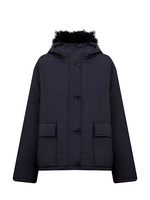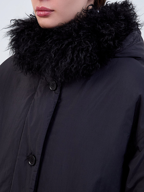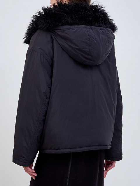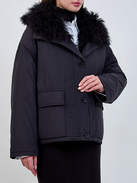 Короткий ультралегкий пуховик с отделкой из овечьего меха