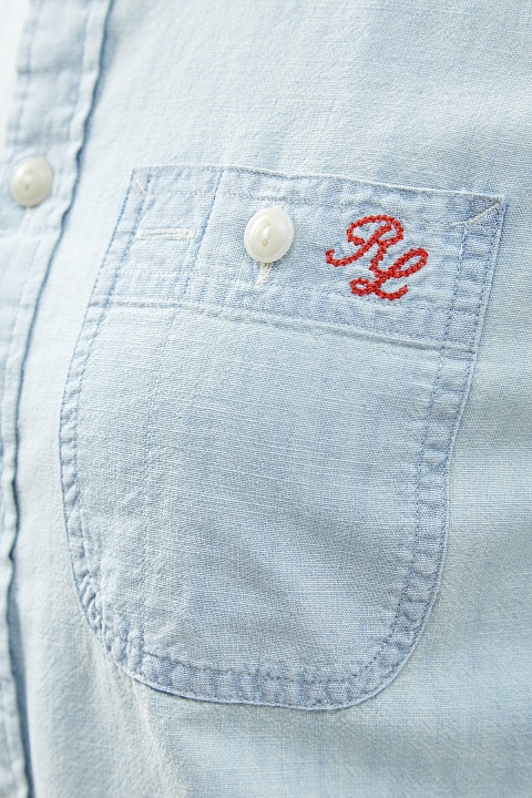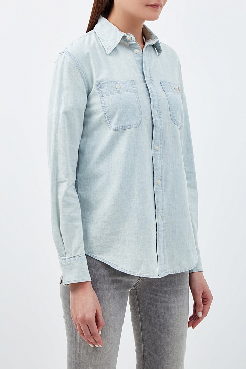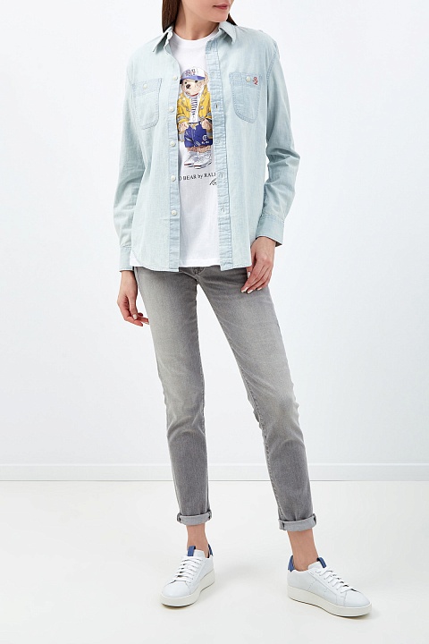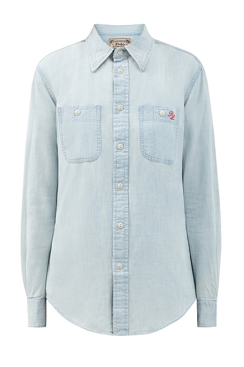 Стильная женская рубашка прямого кроя от Polo Ralph Lauren выполнена из мягкого хлопкового денима голубого оттенка. Неформальный стиль изделия подчеркивает спущенная линия плеч и закругленные нижние кромки. Спинка дополнена макро-аппликацией с изображением медведя Поло — талисмана бренда. Детали: накладные карманы, вышитый логотип.