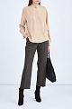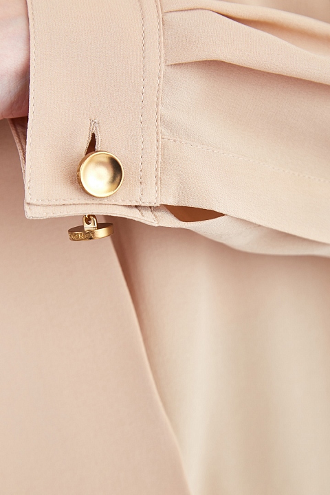 Изысканная женская блуза от Agnona создана из воздушного шелкового крепа мягкого карамельного оттенка с характерным деликатным блеском по поверхности. Модель прямого силуэта и кроя на запах с воротом-стойкой с застежкой на пуговицу с золотистым напылением и тисненой монограммой бренда. Изделие с длинными рукавами дополнено манжетами в классическом стиле. Сделано в Италии.